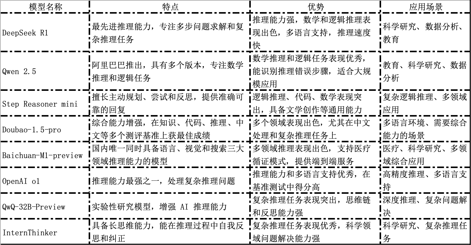 - OpenAI o1:适用于科学研究、软件开发、教育和技术支持等需要深度推理的场景。