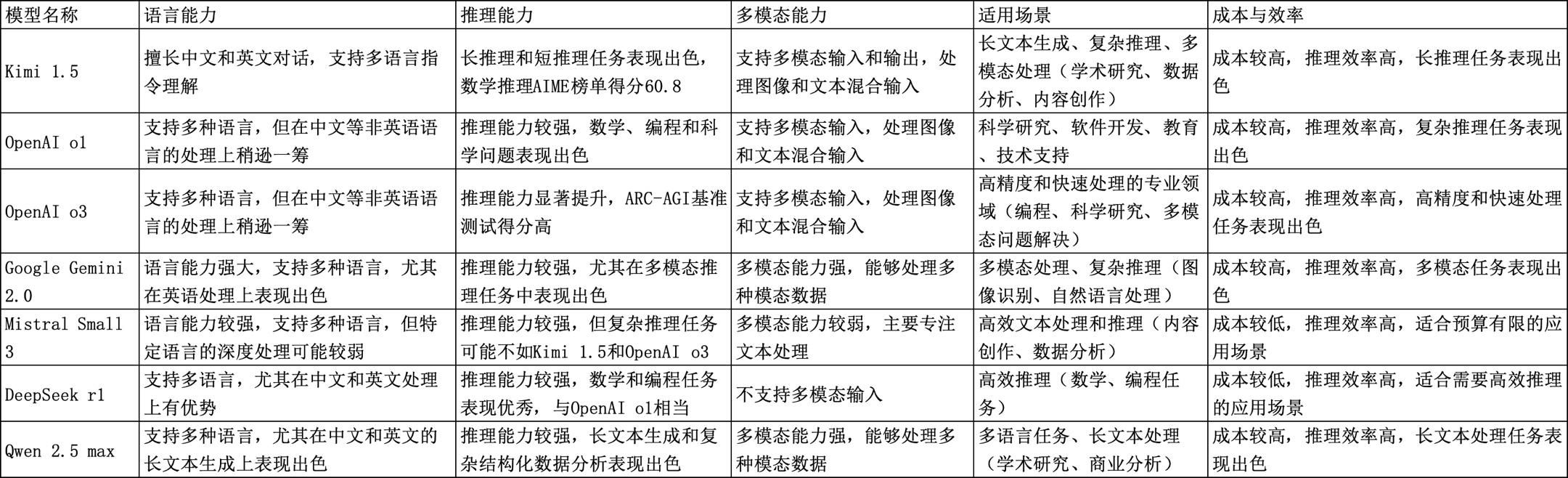 二、主要推理模型的能力比较(包括Kimi 1.5、OpenAI o1和o3、Google Gemini 2.0、Mistral Small 3、DeepSeek r1和Qwen 2.5 max等)