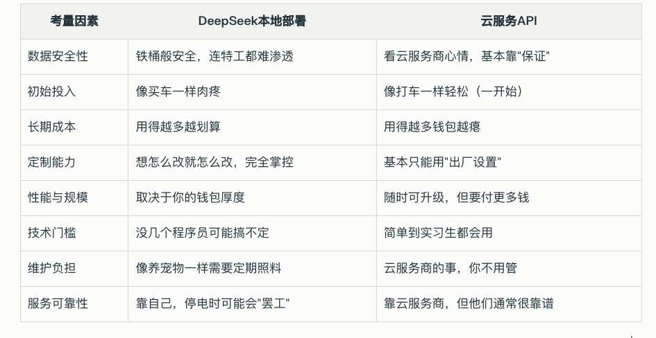 记住,选择本地部署AI就像是决定要不要养宠物 —— 前期投入和持续照料不可避免,但回报的是专属于你的忠诚和定制化服务。只要规划得当,DeepSeek完全可以成为你研究团队的得力助手,而不是一个烧钱的黑洞。