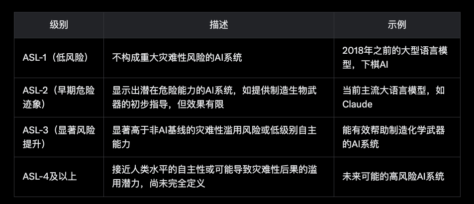 - Anthropic的AI安全等级(ASL)分为ASL-1(低风险)到ASL-4+(高风险),每个级别有相应的安全措施。