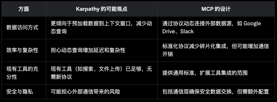 以下表格总结了 Karpathy 可能的不满原因及其与 MCP 的对比: