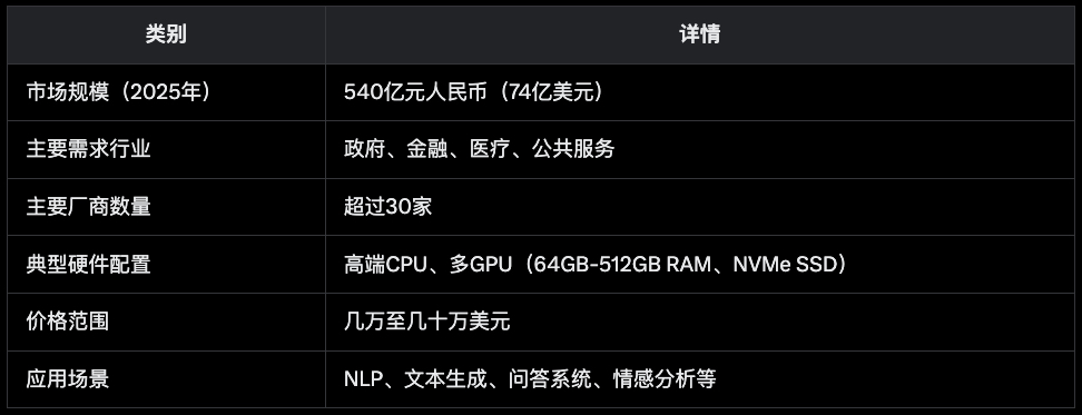 价格因具体配置而异,范围可能从几万美元到几十万美元不等,由于主要面向政府相关市场,虽技术门槛不高但市场不透明,因此利润空间可观。鉴于2025年市场预计达540亿元人民币,单个服务器的价格在这一范围内波动。