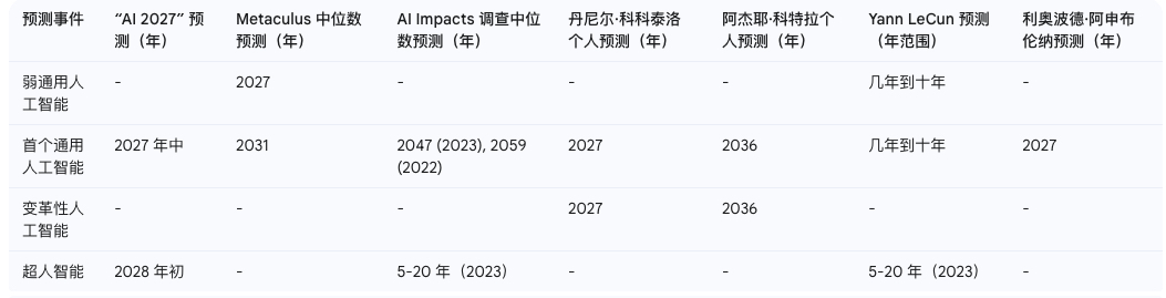 表1:时间线比较:“AI 2027” vs. 专家预测