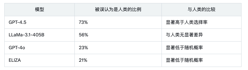 - 当提示采用人性化角色时,GPT-4.5 被误认为是人类的比例达 73%,显著高于真实人类参与者的选择率。