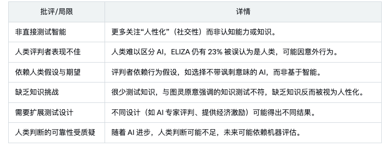 - 图灵测试可能更多衡量“人性化”而非深度理解,批评者认为其存在局限性。