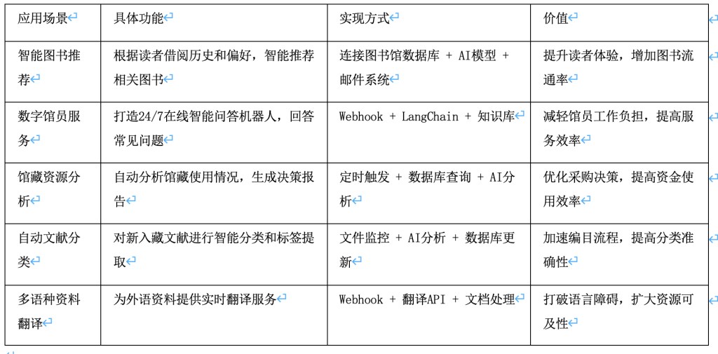 将n8n的自动化能力与人工智能的智慧相结合,可以为图书馆的业务管理和服务平台带来诸多创新应用,从而提升效率、优化用户体验并拓展服务边界。以下场景虽然有很多已经有了AI开发的尝试,但n8n的引入经常可以简化实现,并具有更大的灵活性。