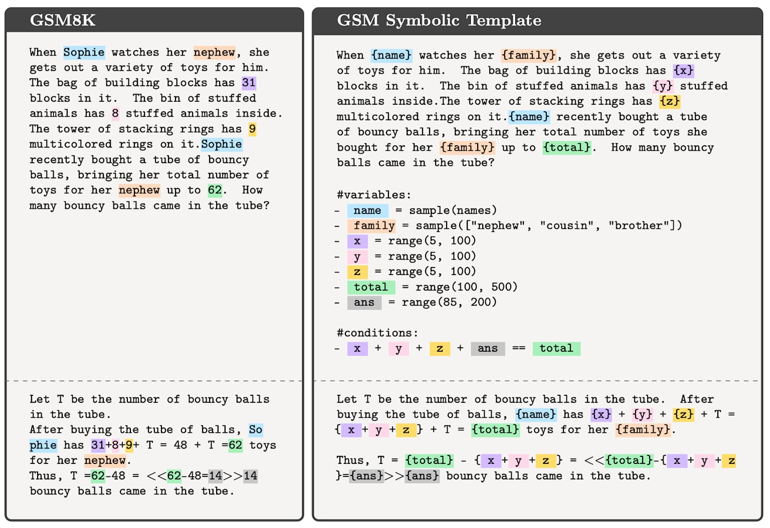 苹果研究团队首先针对广泛使用的GSM8K数学推理基准提出质疑,认为现有评估方法存在数据污染和过拟合问题。为了更客观地测试模型推理能力,研究者开发了GSM-Symbolic基准,这是一个基于符号模板的改进评估工具。