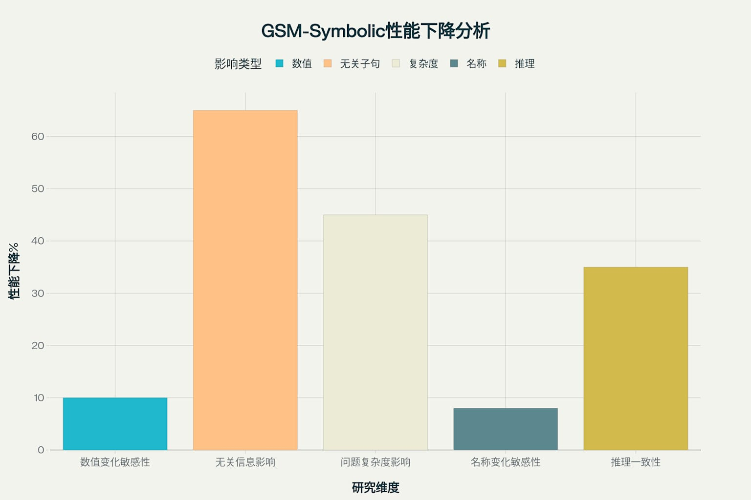 最具颠覆性的发现来自GSM-NoOp实验。研究团队在数学问题中添加了看似相关但实际无关的句子,结果所有模型的表现都出现了断崖式下跌,性能下降幅度高达65%。