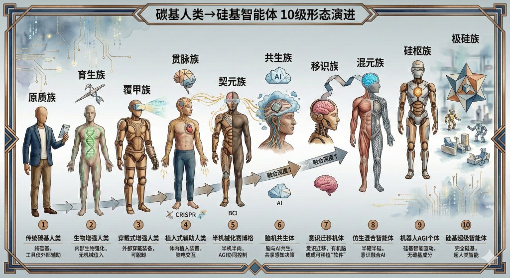 注:上述分类不是严格分割,不同技术和形态之间可能存在过渡和混合。每一类都包含多种具体技术可能性,综合反映了从传统碳基生命到完全硅基智能体的演变趋势(含AGI融合程度和机体结构变化)。上述分类在参考了现有科学研究和技术趋势的基础上提出,以示范碳硅过渡的可能路径。