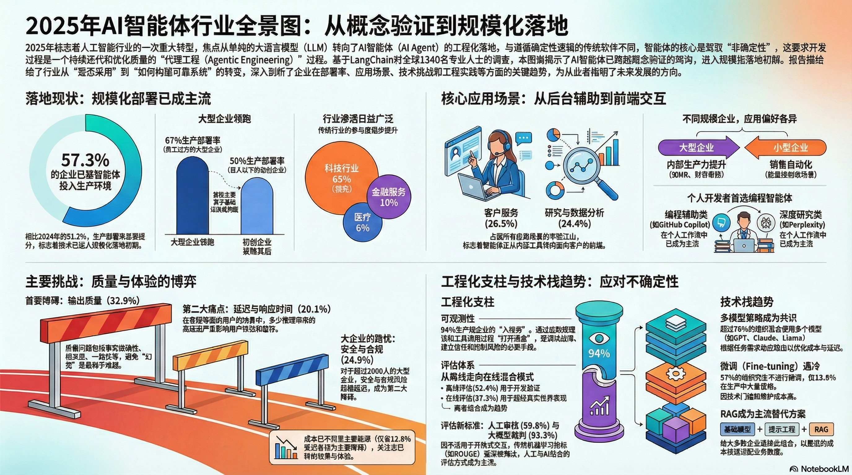 主要结论:2025年标志着人工智能行业重心的根本性转移——从单纯的大语言模型(LLM)狂热,转向了智能体(AI Agent)的工程化落地。LangChain 团队近期对全球 1340 名专业人士进行的深度调查显示,企业关注的焦点已从“是否采用 Agent”转变为“如何构建可靠、高效且可扩展的 Agent 系统”。本文将基于该调查数据,详细剖析 Agent 的落地现状、核心应用场景、面临的技术挑战以及工程化实践的关键趋势。