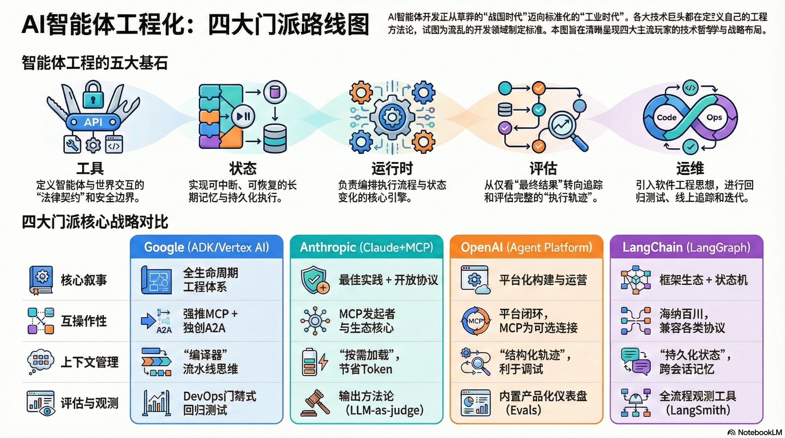 本文将按“工程栈分层”的视角,以Google的工程栈为坐标系,将 Google 的这套方法论与 Anthropic、OpenAI、LangChain 等主流玩家的方案进行“同构对齐”。深度解析各家大厂在架构、协议、评估与运维上的异同,为您呈现一张清晰的Agent技术路线图。通过对比,我们试图回答一个问题:在 Agent 的标准化进程中,巨头们各自把边界画在了哪里?