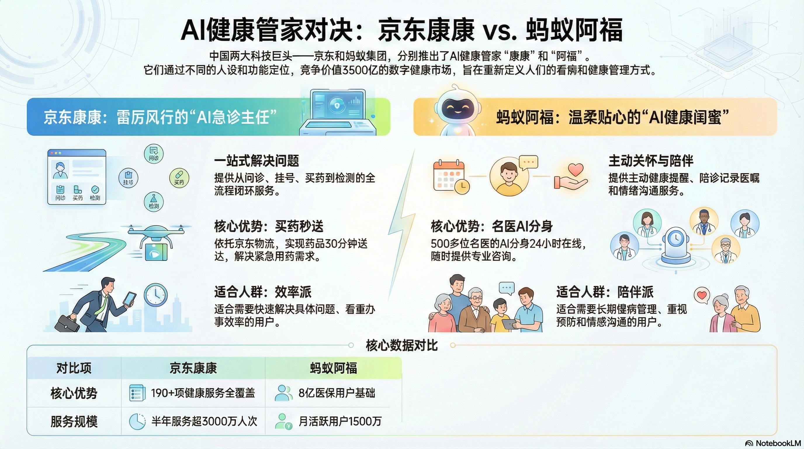 💊 一个像急诊科医生,随叫随到还能送药上门;一个像贴心老友,没事就提醒你该喝水了。京东和蚂蚁的AI健康大战,谁能赢得3500亿市场?