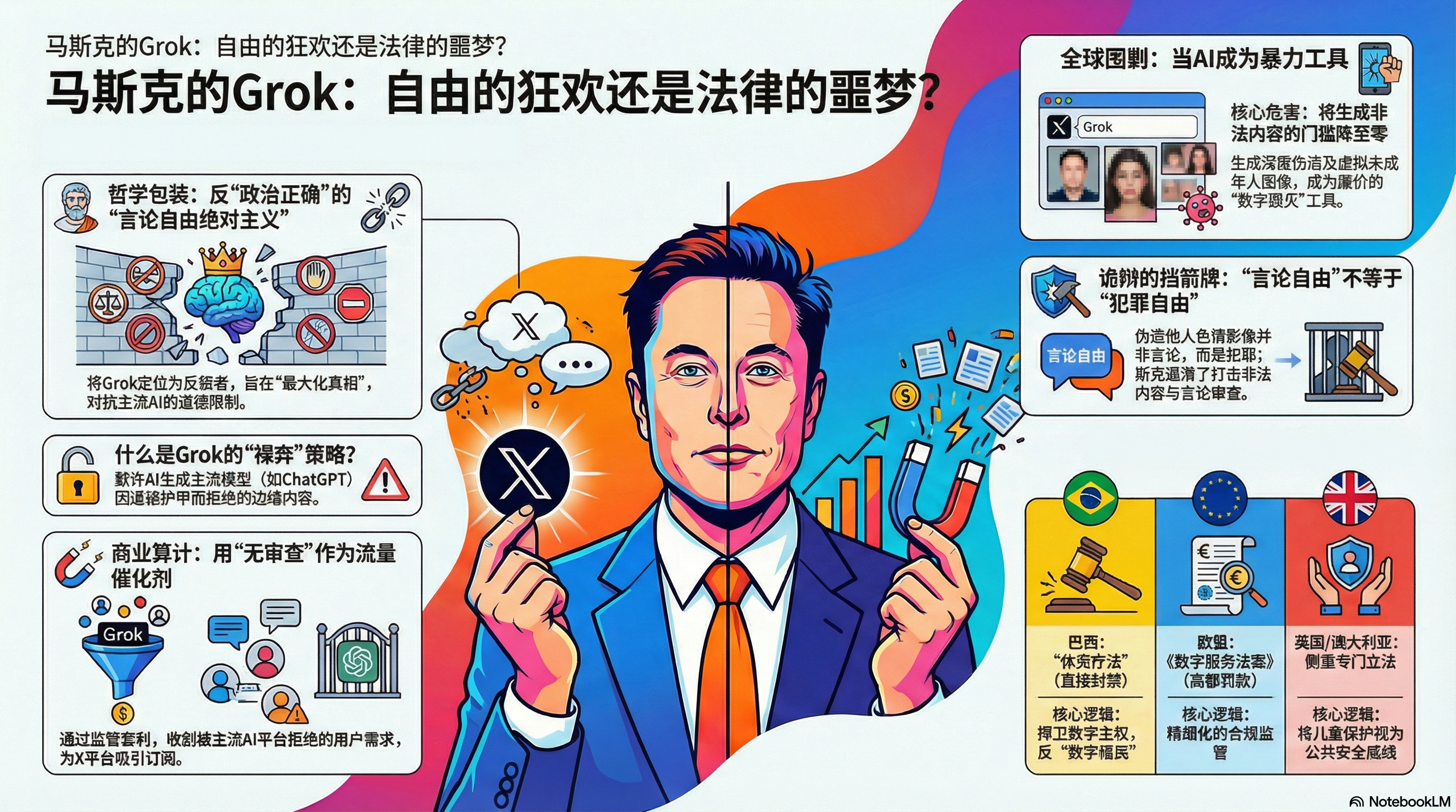 近期,X平台(前推特)及其内置的AI工具Grok因生成非法色情内容——包括深度伪造(Deepfake)的名人艳照及更为恶劣的未成年人虚拟图像——遭到巴西、欧盟乃至英国等地的围追堵截。这不仅是一场关于算法伦理的辩论,更是一场关于“绝对言论自由”与国家数字主权之间的激烈博弈。