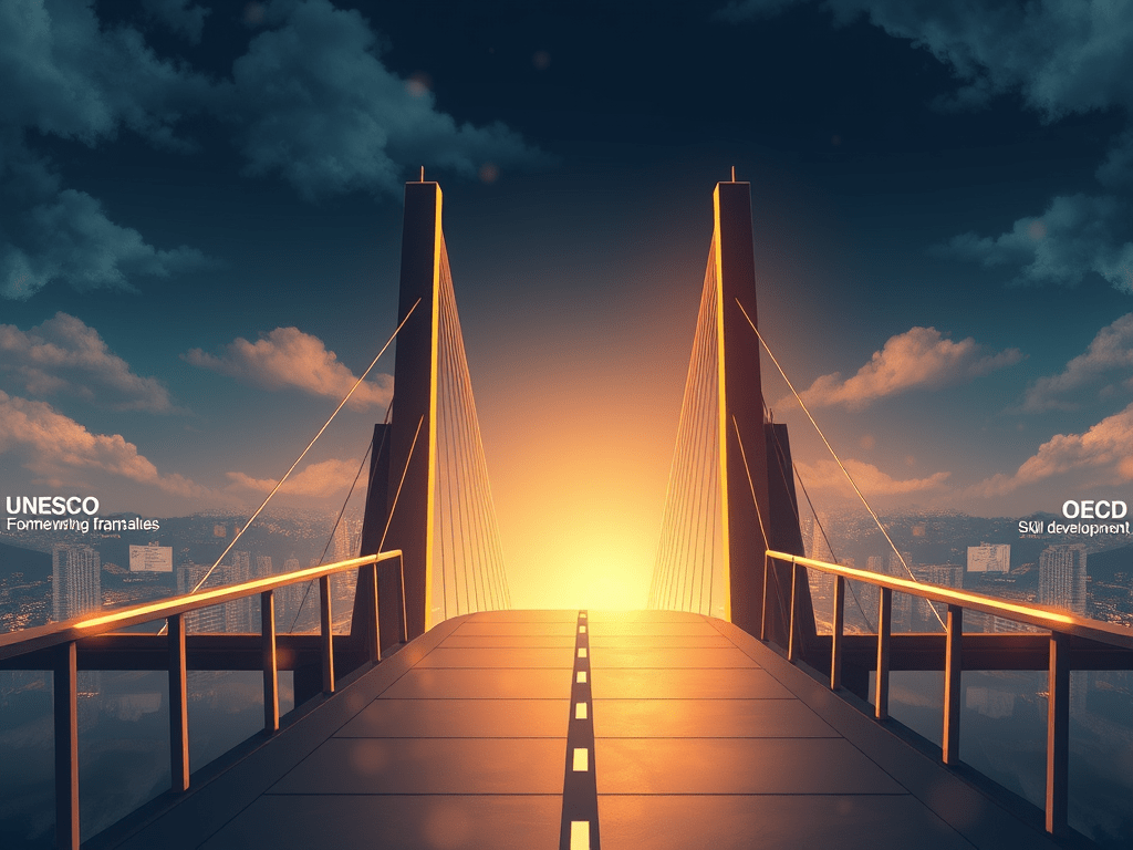 在全球AI素养教育的版图上,有两座灯塔格外耀眼:联合国教科文组织(UNESCO)和经济合作与发展组织(OECD)。它们分别代表了两种看似殊途同归、实则暗藏分野的价值取向。前者强调"人与AI的关系",关注技术对社会公平、文化多样性、人类尊严的影响;后者聚焦"人利用AI的能力",侧重技能培养与问题解决的实用主义。如果把AI素养比作一座桥梁,UNESCO关心的是"这座桥通往何处",而OECD关心的是"如何更快更稳地过桥"。