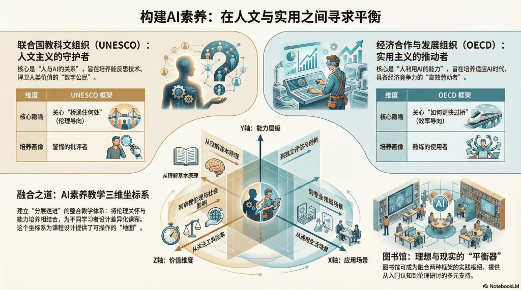 而图书馆,作为知识生产与传播链条上的独特节点,恰好具备了成为这个"平衡器"的条件。它不受学科壁垒的限制,不承担就业率的KPI,却又深度嵌入教学科研全流程。这种位置,使其有可能成为UNESCO理想与OECD现实的对话空间,成为AI素养教育中"道"与"术"相济的实践场。