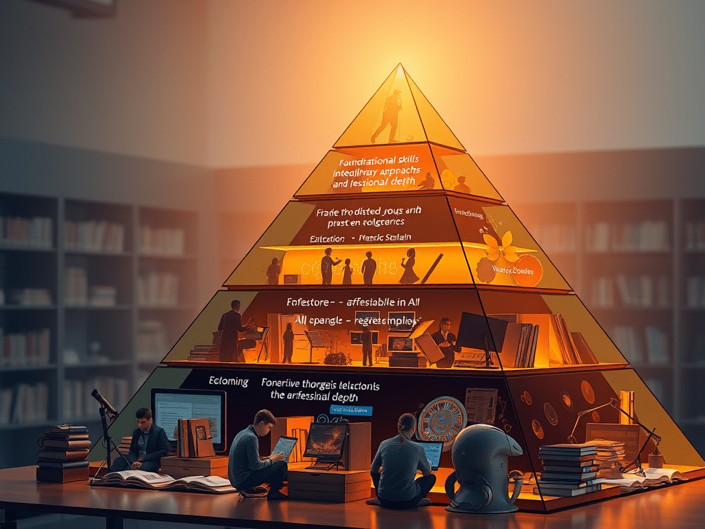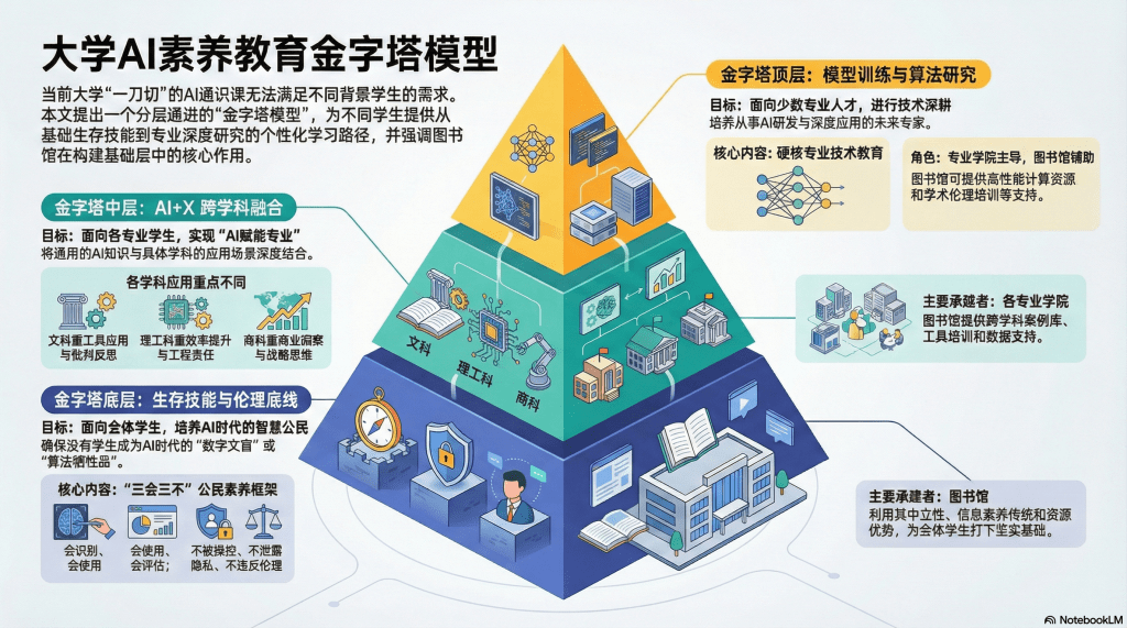 本文提出“金字塔型AI素养教育模型”,从底层的全员普及,到中层的跨学科融合,再到顶层的专业深耕,构建一个完整的生态系统。而图书馆,应该成为这个金字塔“底层”的主要承建者——让每个大学生在专业分流之前,先打下坚实的AI素养地基。