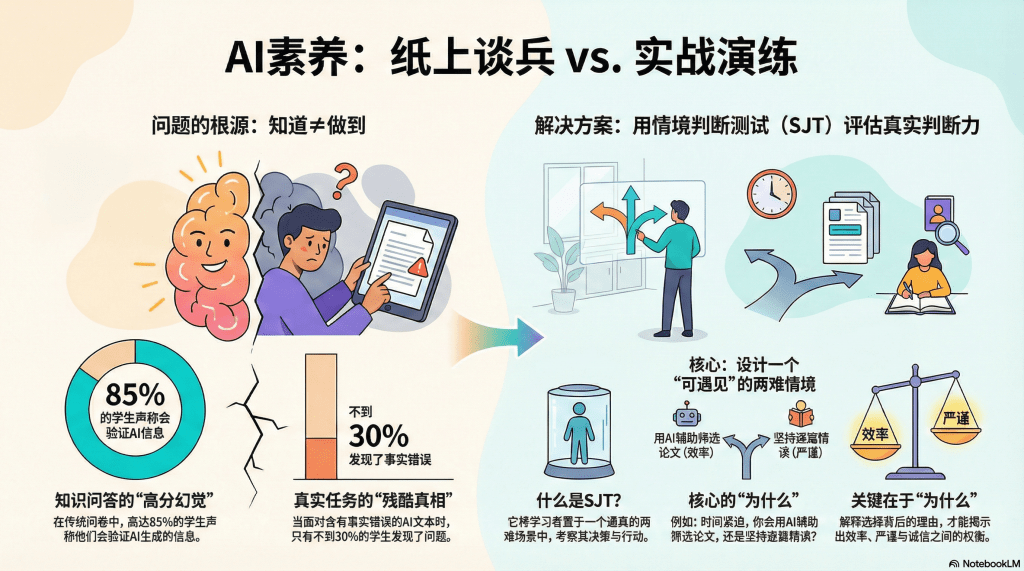 这就是为什么,在AI素养评估领域,一种被称为“情境判断测试”(Situational Judgment Test,SJT)的方法,正在受到越来越多关注。它不问你“懂不懂”,而是把你扔进一个拟真的场景,看你如何反应、如何决策、如何行动——这才是最接近真实世界的测量。