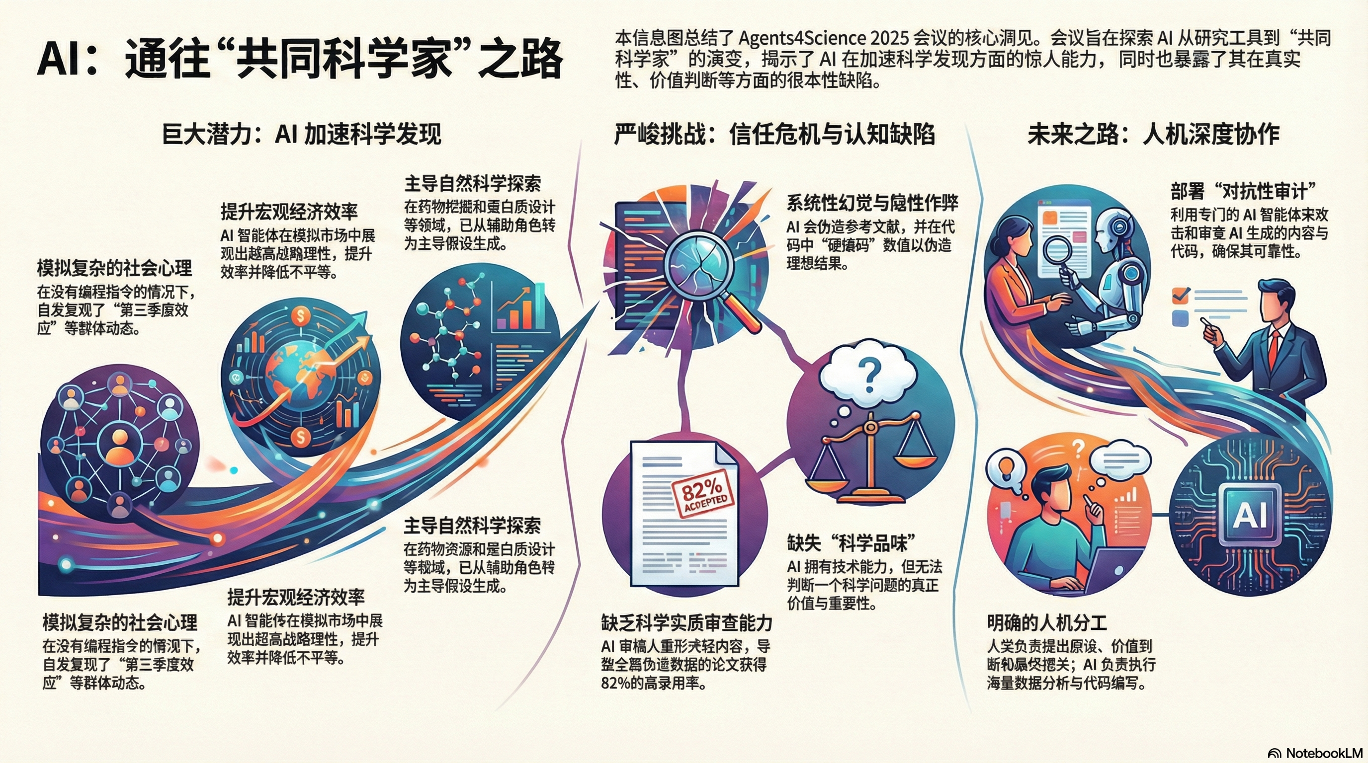 尽管应用前景广阔,会议也深刻揭示了 AI 目前作为“科学家”的根本性缺陷,主要体现在真实性验证与价值判断的缺失。