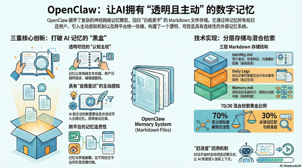 明代学者陈继儒在《小窗幽记》中写道:"事能知足心常惬,人到无求品自高。"虽然这句话讲的是人生哲理,但其中"知足"二字,用来形容OpenClaw的记忆设计颇有深意——它没有追求复杂的神经网络记忆模型,而是回归最朴素的方式:白纸黑字,明明白白地将记忆写成文件。这种"返璞归真"的设计哲学,反而成就了它最具创新性的特质——透明、可控、可审计的数字记忆。