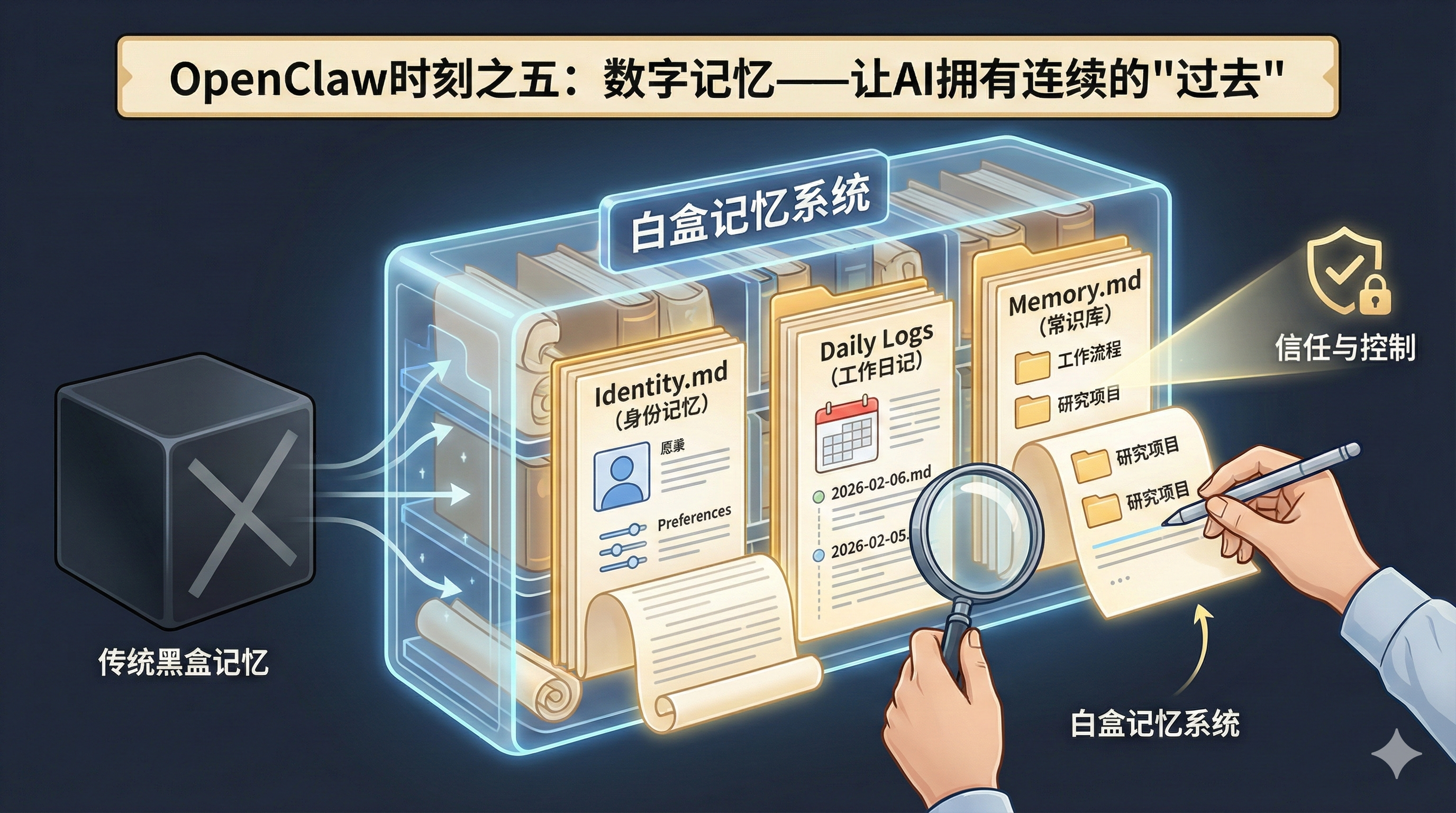 明代学者陈继儒在《小窗幽记》中写道:"事能知足心常惬,人到无求品自高。"虽然这句话讲的是人生哲理,但其中"知足"二字,用来形容OpenClaw的记忆设计颇有深意——它没有追求复杂的神经网络记忆模型,而是回归最朴素的方式:白纸黑字,明明白白地将记忆写成文件。这种"返璞归真"的设计哲学,反而成就了它最具创新性的特质——透明、可控、可审计的数字记忆。