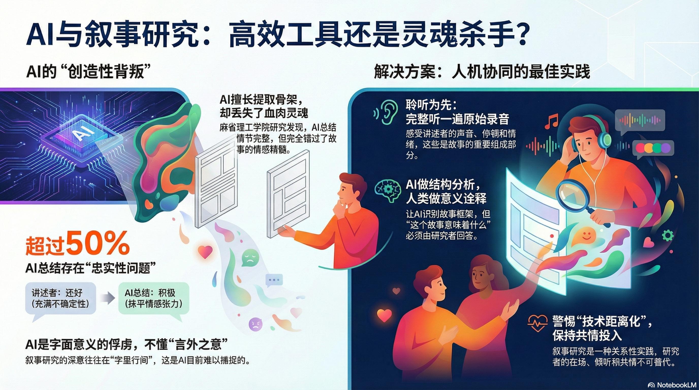 使用AI可能无意中让你与参与者的故事保持距离,避免情感卷入。但叙事研究要求的恰恰是有节制的情感投入(bounded engagement)。技术工具不应成为情感保护的盾牌。