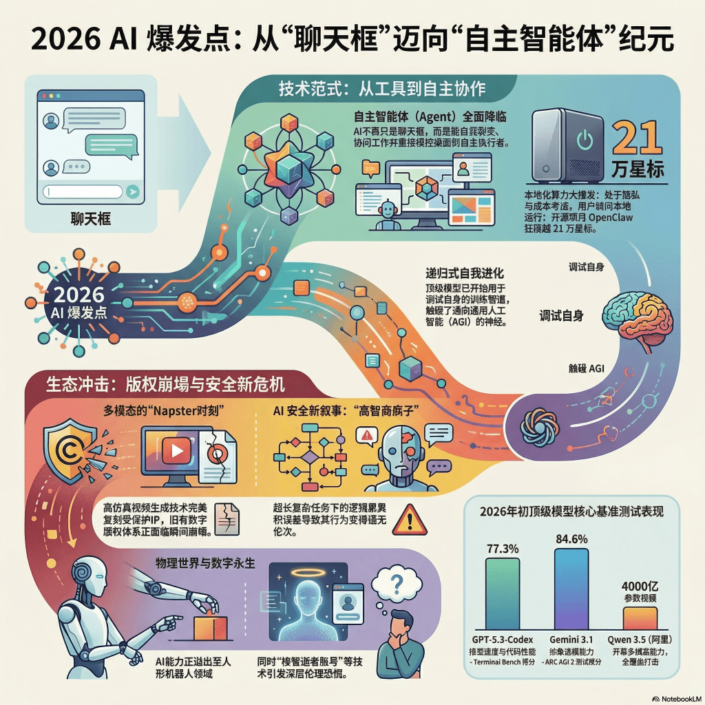 如果说以前是参数规模堆砌带来基础大语言模型(LLM)的大基建,那么2026年开年的这几个月,无疑标志着AI发展史上的另一个爆发点tipping point。本周的人工智能领域又双叒叕经历了一场前无古人的“技术海啸”,不仅五大顶尖模型在同一时间发布了极具颠覆性的更新,更重要的是,技术落地的形态正在发生根本性转移:用户正在从依赖云端SaaS服务,不可逆转地向本地化、多智能体(Multi-Agent)协作转移。