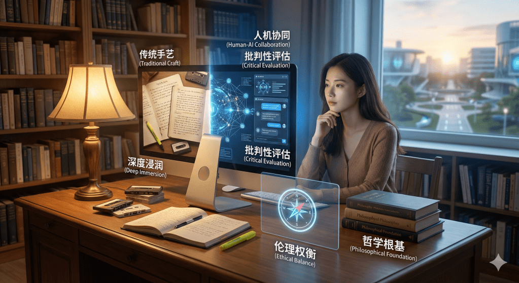 五年后的今天,她已经能够熟练地“驾驭”AI——知道什么任务可以交给它,什么必须自己做;知道如何设计提示词,如何批判性评估输出;知道在伦理和效率之间如何权衡。