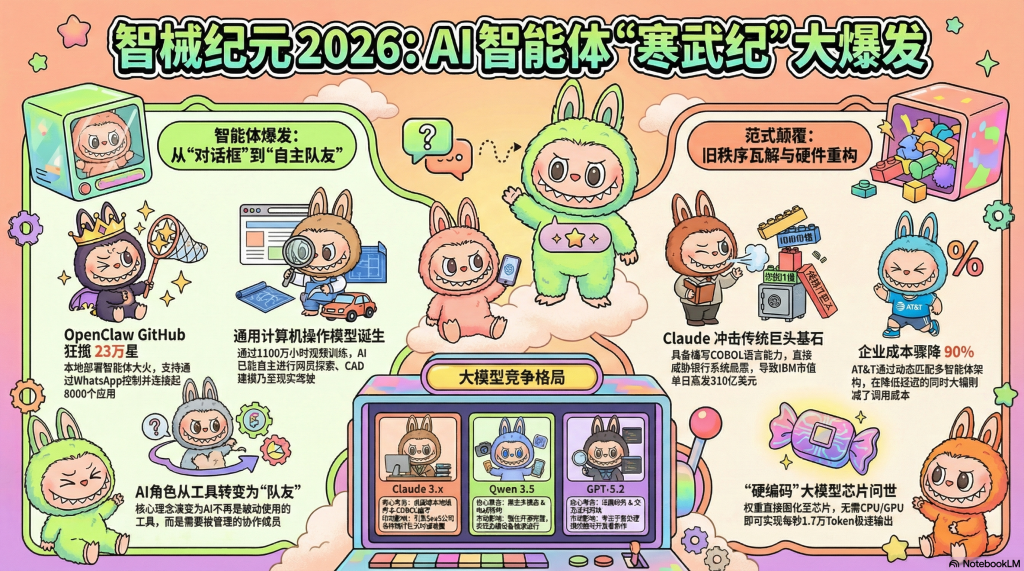 2026年2月末的这一周,犹如一部信息量超载的科幻断代史。我们看到底层模型已经强大到足以一夜之间摧毁一个百亿美元的传统IT赛道,看到硬编码芯片正在将智能的边际成本降至趋近于零。从云端的巨兽(Claude、Qwen 3.5旗舰)到桌面端狂奔的智能体(OpenClaw),技术突破的周期正在以“周”为单位被疯狂压缩。