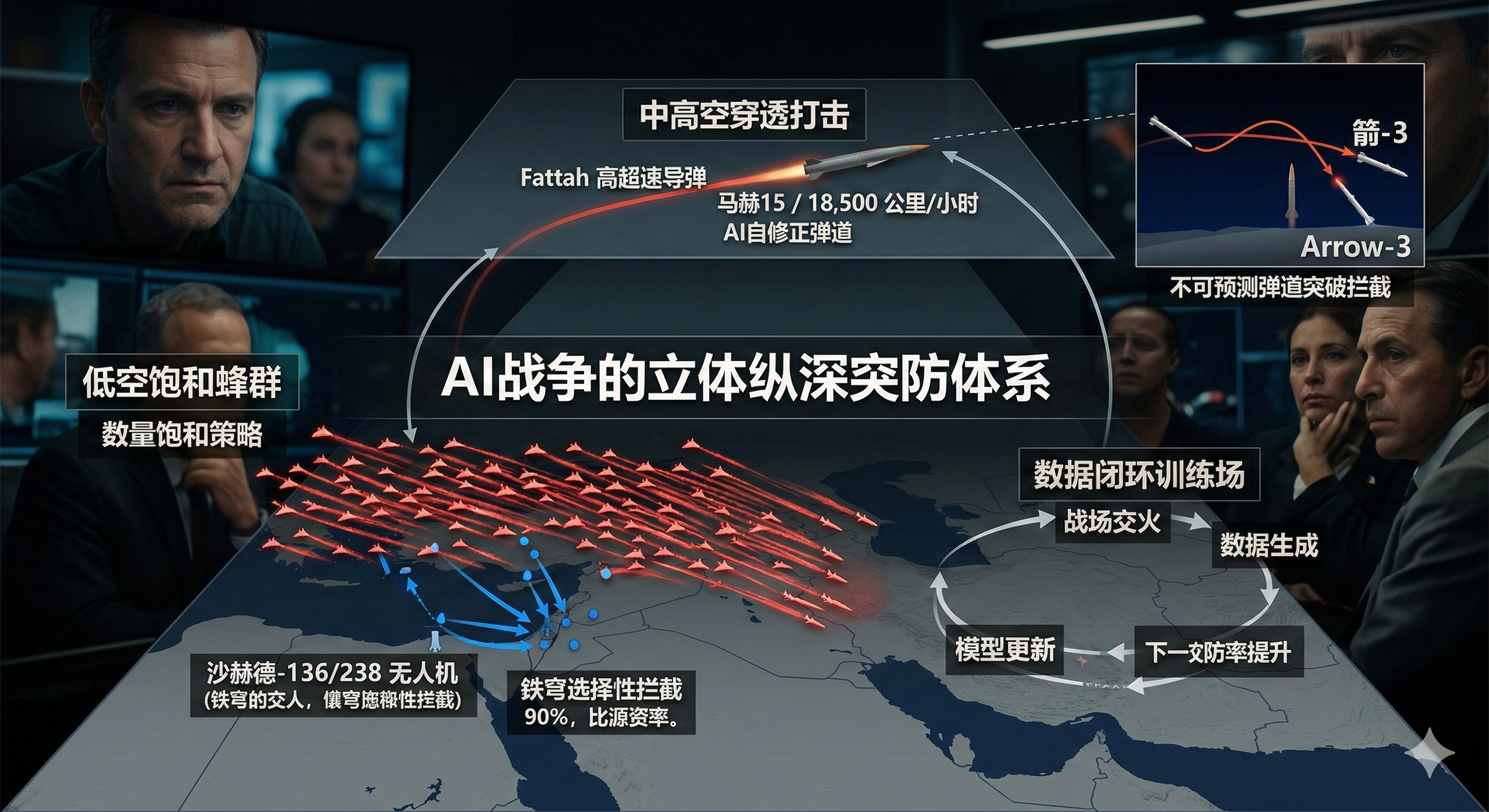 这构成了蜂群策略的立体纵深:低空有沙赫德-136/238无人机群以数量饱和防空系统的近程拦截资源,中高空有弹道导弹和Fattah高超音速导弹以速度和机动性挑战远程拦截系统,网络空间有电子战干扰防空雷达的探测能力。三个层次同时施压,每个层次都有AI加持——防御方必须在毫秒级别内同时应对三种截然不同性质的威胁,而攻击方的每一层都在实时适应防御方的响应。
