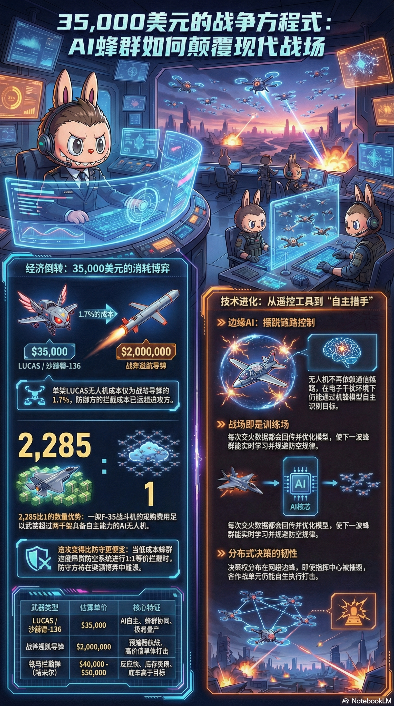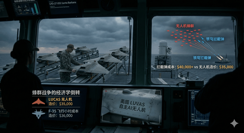 这是一架LUCAS无人机的全部造价。它可以飞越数百公里,在没有人类操控的情况下自主导航到目标区域,识别并攻击一个价值数百万甚至数亿美元的目标——一套防空系统、一个雷达站、一艘巡逻艇。即使它被击落了,攻击方损失的也只是三万五。而拦截它的那枚防空导弹,可能就值四万。