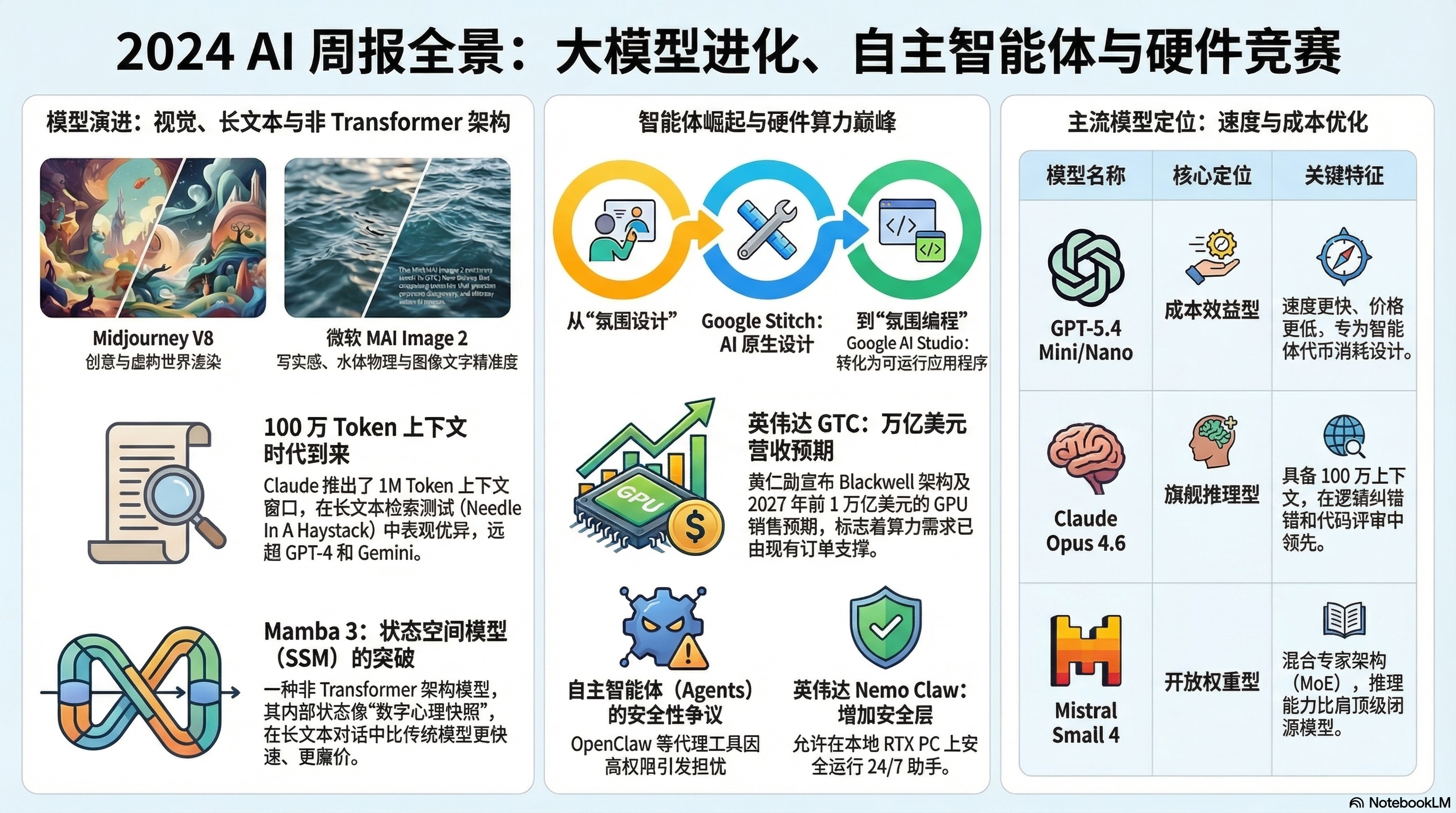 - “吞噬一切”的长上下文:Claude Opus 4.6和Sonnet模型全面开放了100万Token的上下文窗口,且在海量信息中的精准检索率(大海捞针)高达近80%,远超GPT和Gemini。英伟达发布的开源模型Nemotron 3 Super同样支持百万上下文,并创新性地采用了Transformer与Mamba混合架构,在原生4位量化下进行了深度优化。