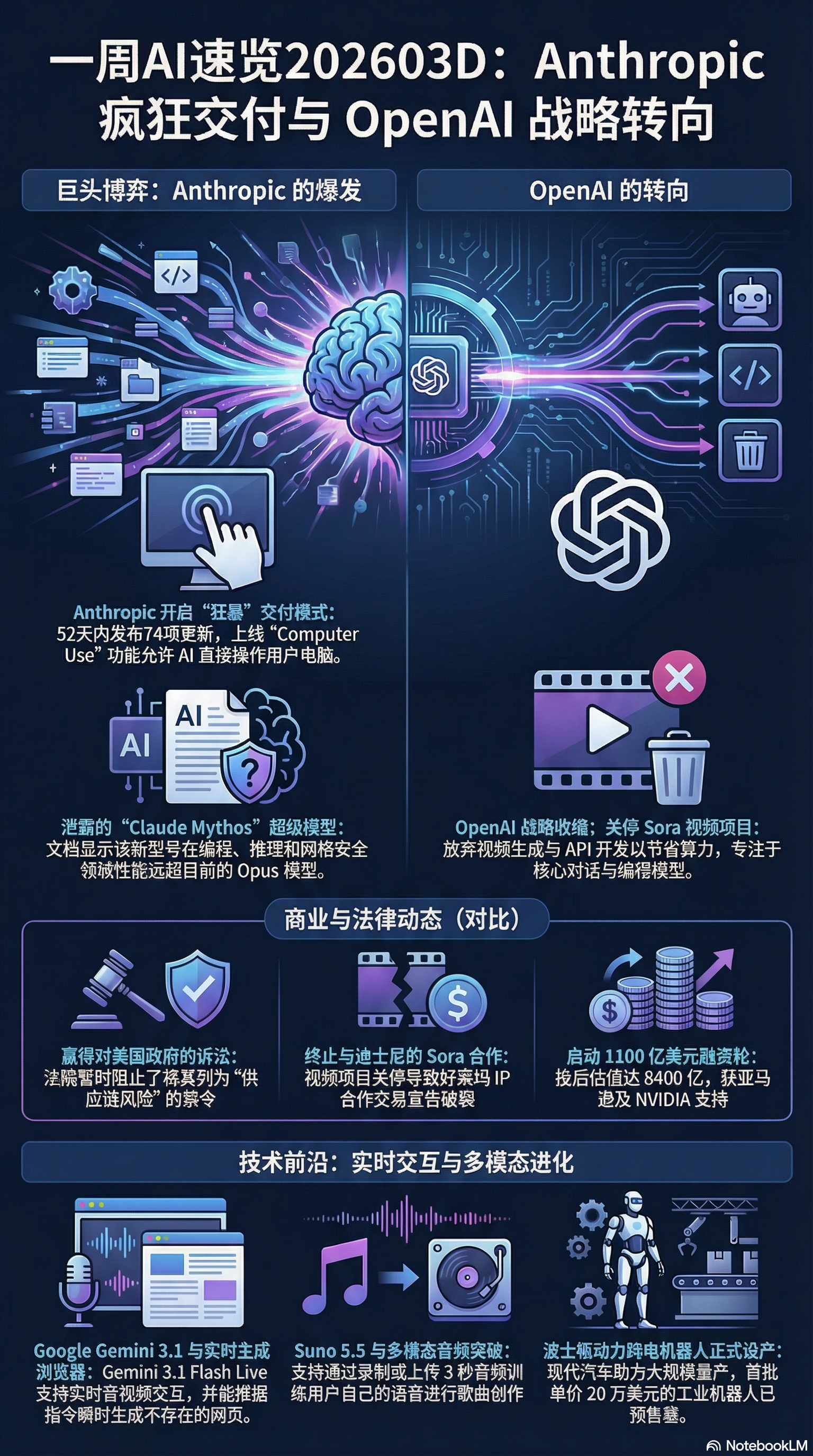 2026年3月末的AI行业,看起来正走向一个极具戏剧性与破坏力的历史拐点。如果我们站在过去一年的时间轴上回望,生成式媒体的狂热正在迅速冷却,取而代之的是由”自主智能体(Agents)”与”长期记忆系统”主导的务实主义狂飙。这是一个矛盾交织的时刻:一边是OpenAI拿下千亿美元量级的史诗级融资,另一边却是甲骨文和Meta数以万计的员工因AI冗余而被无情裁撤。大模型正在褪去”聊天窗口”的温和伪装,以不可阻挡之势接管桌面系统、重构商业协议,甚至直接介入半导体制造与重工业流水线。本周的行业巨震,预示着AI技术已彻底步入深水区。