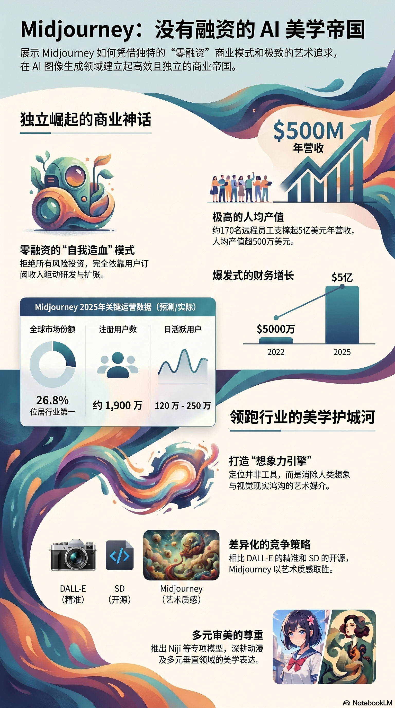 2025年,Midjourney达成了一个里程碑——年收入突破5亿美元。这个数字不仅代表着商业成功,更代表了一种选择的胜利。
